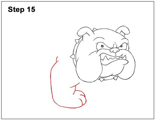 Langkah 15: Gambarkan kaki depan bulldog kartun dengan terlebih dahulu menggambar dua garis yang mirip dengan huruf T di bagian bawah, sisi kiri kepala. Di sebelah kiri garis berbentuk T, gambar garis vertikal panjang melengkung untuk sisi lain kaki. Lanjutkan menggambar garis di bagian bawah sehingga kurva ke kanan dan membentuk bagian bawah kaki. Tutup bentuk kaki dengan menggambar garis melengkung di sebelah kanan. Tambahkan beberapa garis pendek di dalam untuk memisahkan jari kaki.